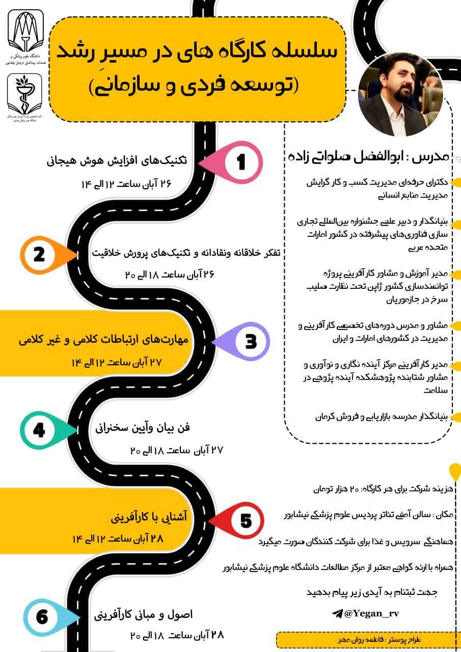 سلسله کارگاههای در مسیرِ رشد (توسعه فردی و سازمانی) کمیته دانشجویی توسعه آموزش دانشگاه علوم پزشکی نیشابور اولین سلسله کارگاه های در مسیر رشد ( توسعه فردی وسازمانی ) را ویژه کلیه دانشجویان مقاطع مختلف برگزار میکند. اهداف همایش: آشنایی با تکنیک های افزایش هوش هیجانی – ار....